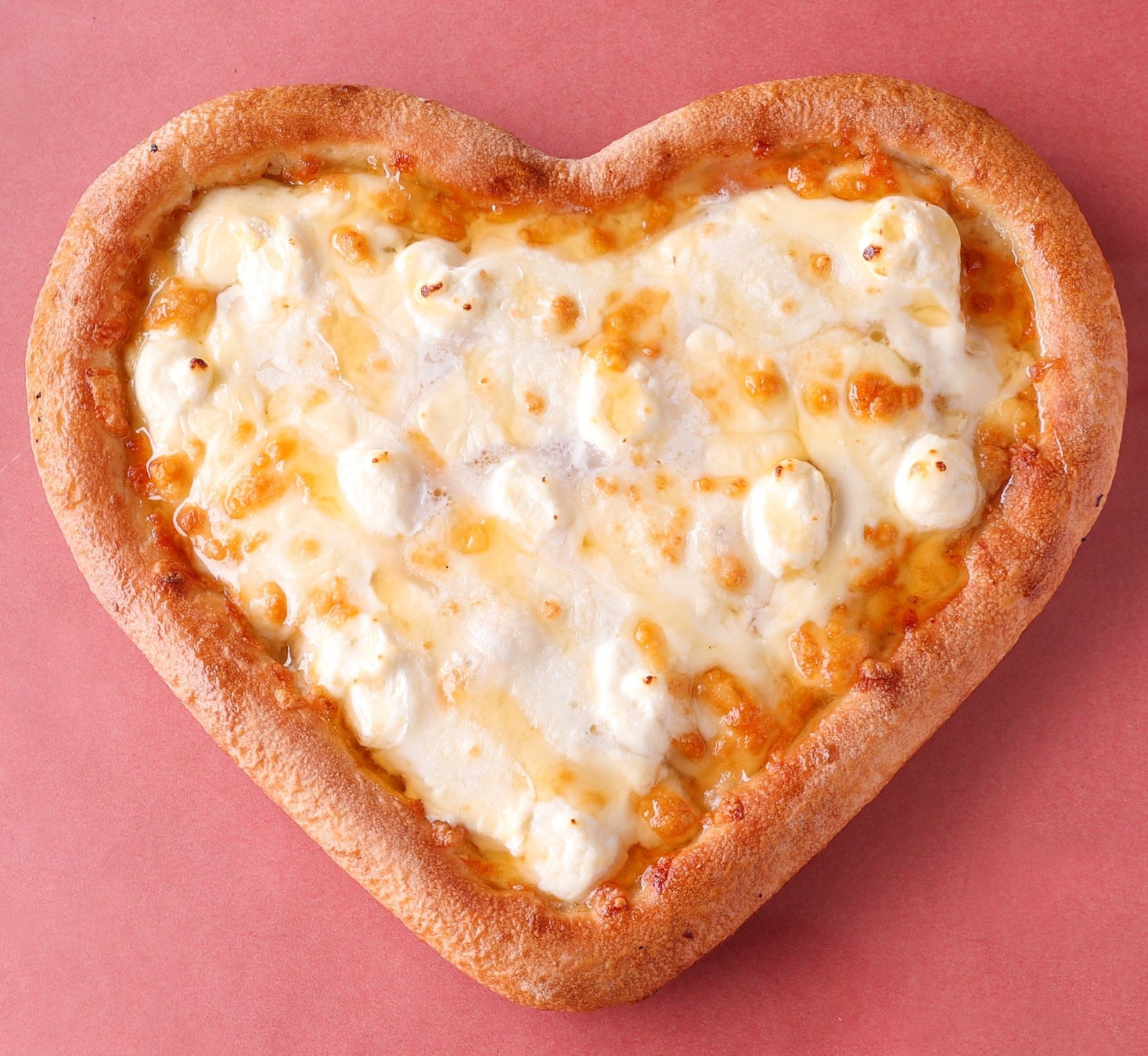 イタリア産モッツァレラ、北アルプスあづみ野地方で作られたクリームチーズ、カマンベールを使用したとろけるチーズなど、こだわりのチーズたっぷりの真っ白なハートピザ。