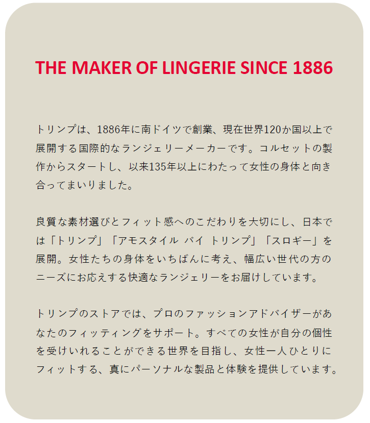 身につけるひとのボディも心もやわらかく包み込むやさしい着け心地、そして秋のファッションをよりエレガントに際立たせるバストシルエットメイク。この秋冬、より自分が輝けるランジェリーに出会いませんか?