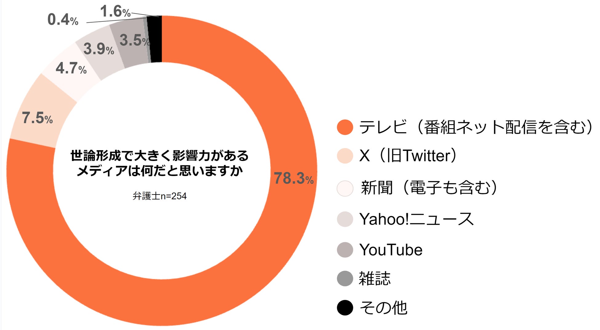 世論形成で大きく影響力があるメディアを尋ねたところ、「テレビ」が78.3%と約8割を占め最も高くなりました。次いで「X(旧Twitter)」が7.5%、「新聞」が4.7%となっています。