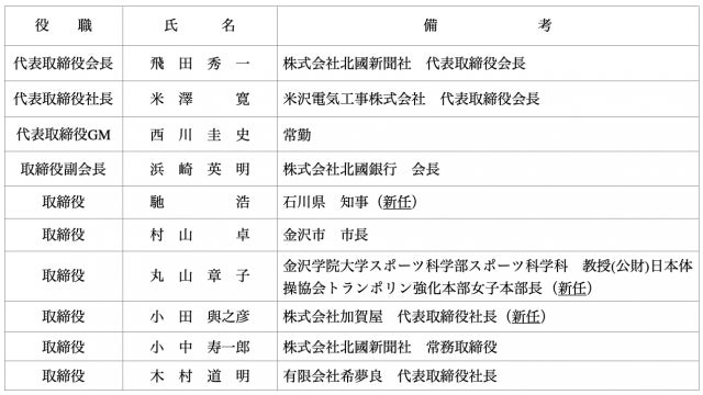 新任取締役として、石川県知事の馳浩氏、金沢学院大学スポーツ科学部スポーツ科学科教授((公財)日本体操協会トランポリン強化本部女子本部長)の丸山章子氏、株式会社加賀屋代表取締役社長の小田與之彦氏が就任いたしました。
