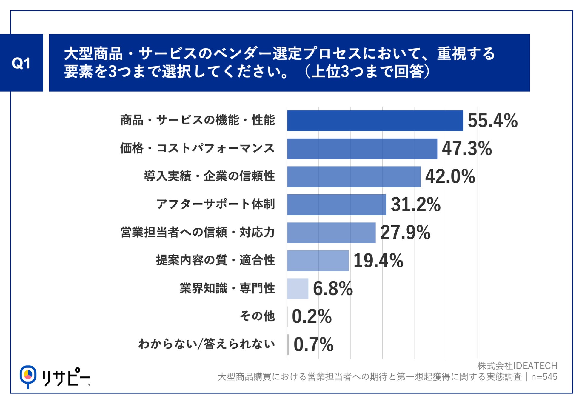 「Q1.大型商品・サービスのベンダー選定プロセスにおいて、重視する要素を3つまで選択してください。(上位3つまで回答)」(n=545)と質問したところ、「商品・サービスの機能・性能」が55.4%、「価格・コストパフォーマンス」が47.3%、「導入実績・企業の信頼性」が42.0%という回答となりました。