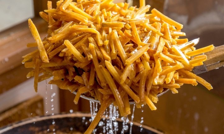 『塩けんぴ』は、高知県の銘菓でもある芋けんぴに、高知県室戸海洋深層水塩と砂糖を合わせて炊きあげた蜜をコーティングすることで、ほんのり塩味のする甘から風味にアレンジした同社オリジナルのお菓子です。