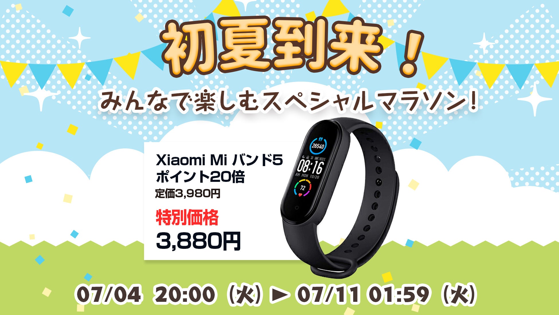 楽天市場「Show !t」は7月4日(火)20時から、シャオミのMiバンド5が通常価格3,980円(税込)のところ3,880円(税込)の特別価格で販売し、さらにご購入の方にポイント20倍プレゼントを実施します。また、7月4日(水)20:00~7月26日(火)01:59まで開催される、楽天お買い物マラソンに参加し、ポイント10倍プレゼント(一部商品を除く)を実施します。この機会にシャオミのスマートバンドMiバンド5でポイントをザクザク貯めましょう。