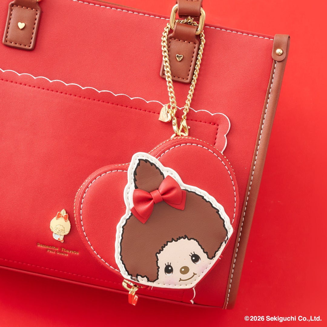 「モンチッチちゃん」の愛らしい顔をワッペン風にデザインしたハート型ポーチ。