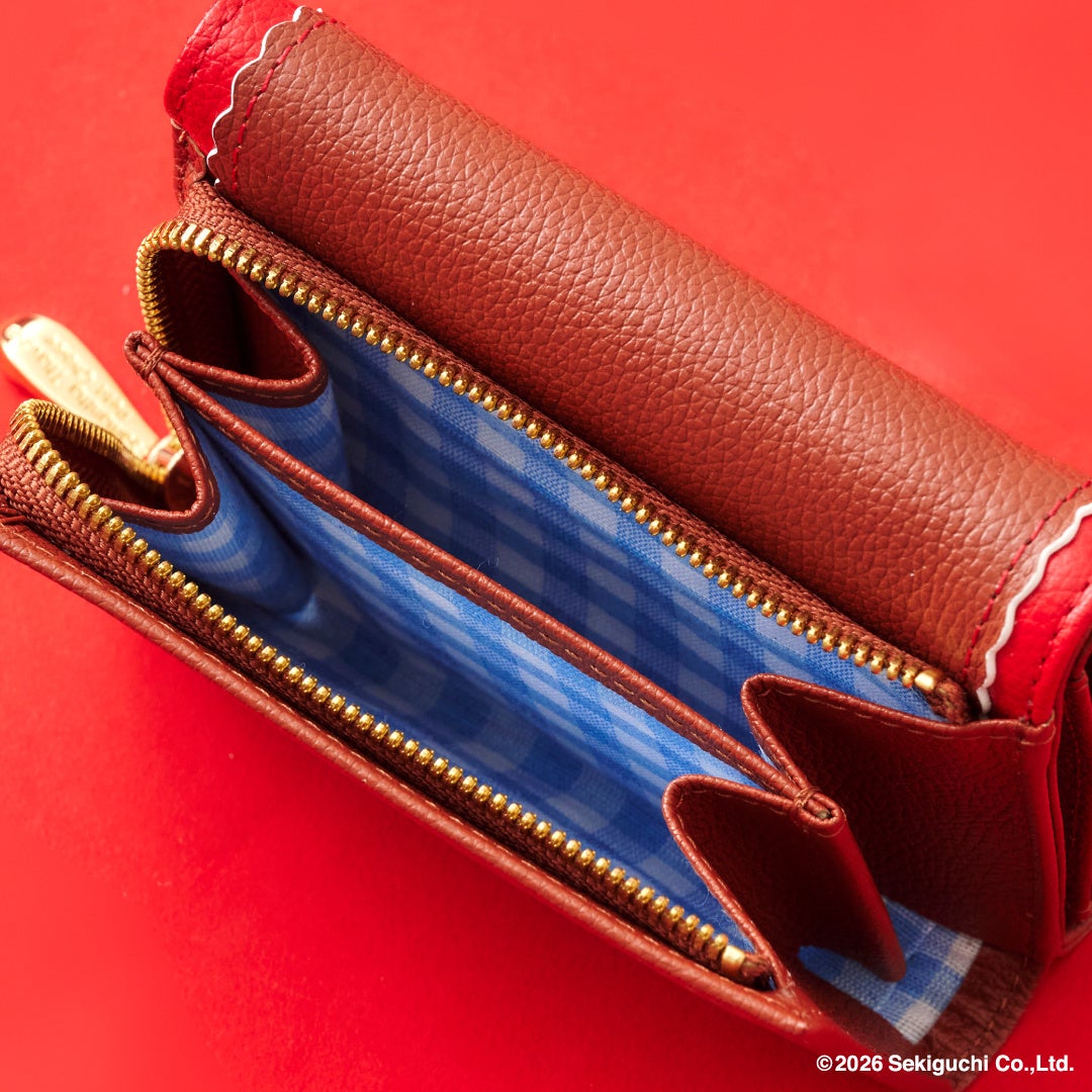 「モンチッチちゃん」をイメージしたブラウン×レッドの配色、スカラップのデザインがポイント。