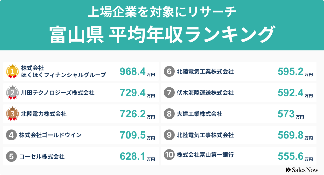 【富山県】上場企業平均年収ランキングTOP10!/SalesNow DBレポート