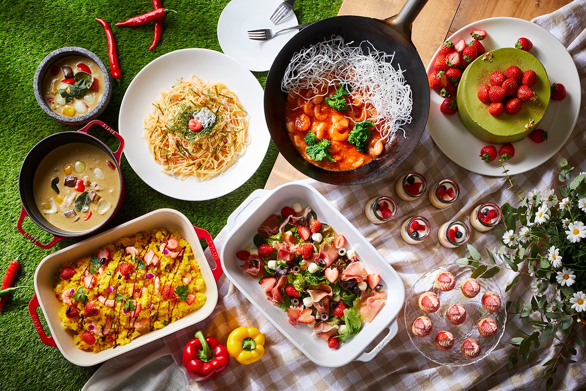春キャベツや新玉ねぎ、しらす、桜えびなど、みずみずしい春野菜や旬の食材をふんだんに使用した華やかなメニューの他、「苺、サフランライス、海老のサラダ」に「苺、生ハム、モッツァレラチーズ」といった、色鮮やかないちごの料理がテーブルを彩ります。また、本場のレシピで仕上げた「タイグリーンチキンカレー」や「海老のチリソース」など、世界の味覚を楽しめるバリエーションに富んだメニューも多数ご用意。どなたでもご満足いただけるラインナップです。