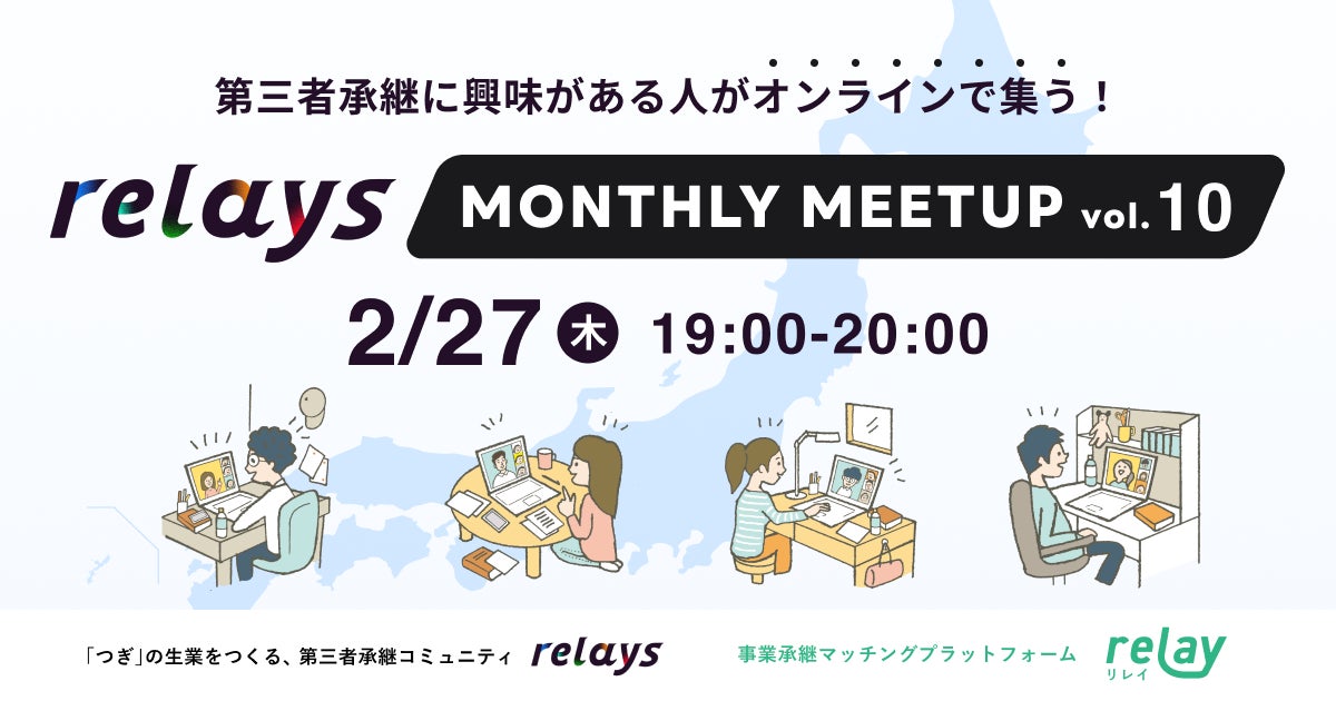 【2025年最初のオンライン交流会】第三者承継コミュニティ「relays(リレイズ)」、「relays MONTHLY MEETUP vol.10」開催決定!2月27日(木)開催。