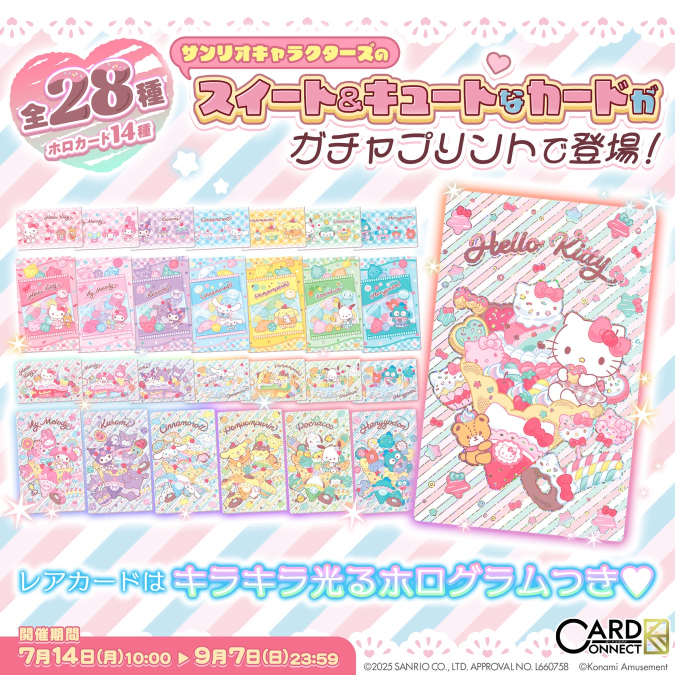 株式会社コナミアミューズメントは、アミューズメント施設向けカードプリントゲーム機『カードコネクト』にて、株式会社サンリオのキャラクターたちとのコラボデザインイベントを7月14日(月)から9月7日(日)まで開催することをお知らせします。
