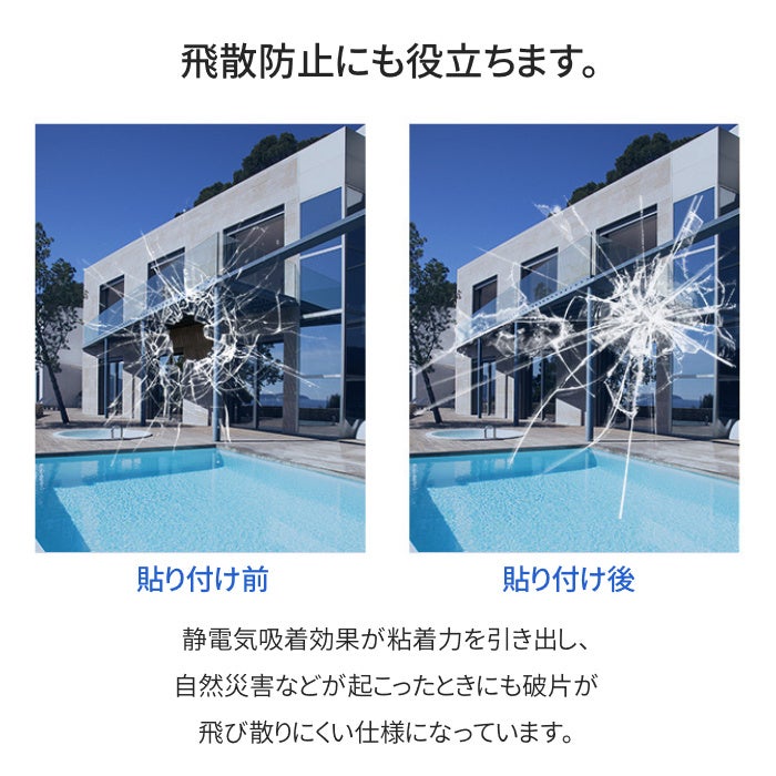 静電気吸着効果で、台風や地震時にガラスが割れても破片は飛び散りません。
