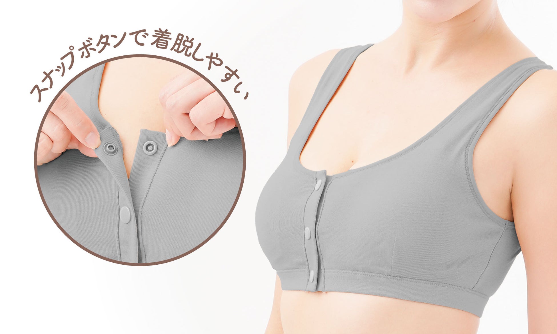 スナップボタンで簡単着脱できます。授乳時にもさっと開閉できて便利!また、介護でも大活躍!