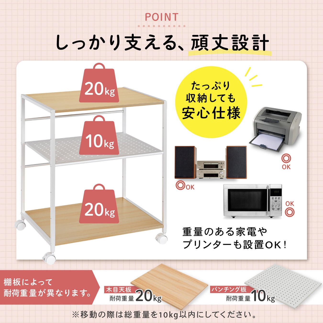 耐荷重は木目天板20kg、パンチング板10kgで、合計50kgまでしっかり支えます。キャスター付きで移動が簡単。10kg以内であれば、物を乗せたままでもスムーズに移動可能。前輪2つにはロック機能を搭載し、しっかり固定できます。
