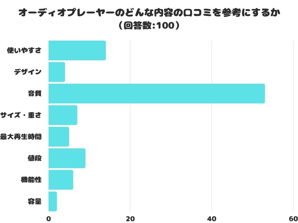 オーディオプレーヤーのどんな内容の口コミを参考にするかをアンケートにて調査したところ、1位は「音質」 でした。