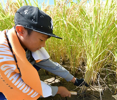 この日、長靴・軍手姿の児童53人に加え、地元農家・保護者30人が学習田に集合。児童は、先生から「稲を束にして、地面から5センチメートルくらいの部分を、手を切らないように親指を必ず上にして持ちながら刈りましょう」など稲を刈るコツについてアドバイスを受けた後、鎌を持って田んぼの中へ。農家の人や保護者とともに、次々と稲を刈り取った後、適量に束ねて稲木にかけていきました。児童は、「今年は暑かったから稲が育つかちょっと心配だった。疲れたけれどみんなで稲刈りができて楽しかった」「初めてだったから最初は難しかったけれど、慣れたら早く刈れるようになった」などと笑顔で話していました。