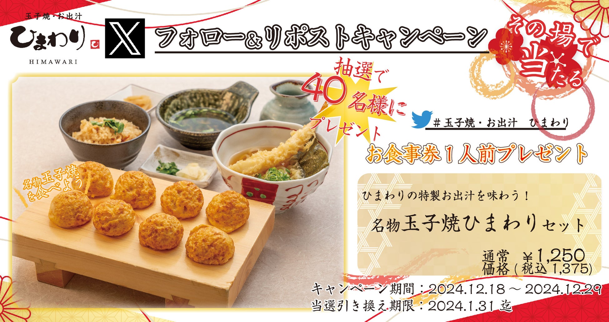 この度、玉子焼・お出汁ひまわり公式Xアカウントとフォロー&リポストして応募すると、抽選で40名様に「名物玉子焼ひまわりセット1人前(税込み1,375円)」をお召し上がりいただけるデジタルお食事券プレゼントキャンペーンを2024年12月18日(水)より開催します。この機会にぜひご応募ください。