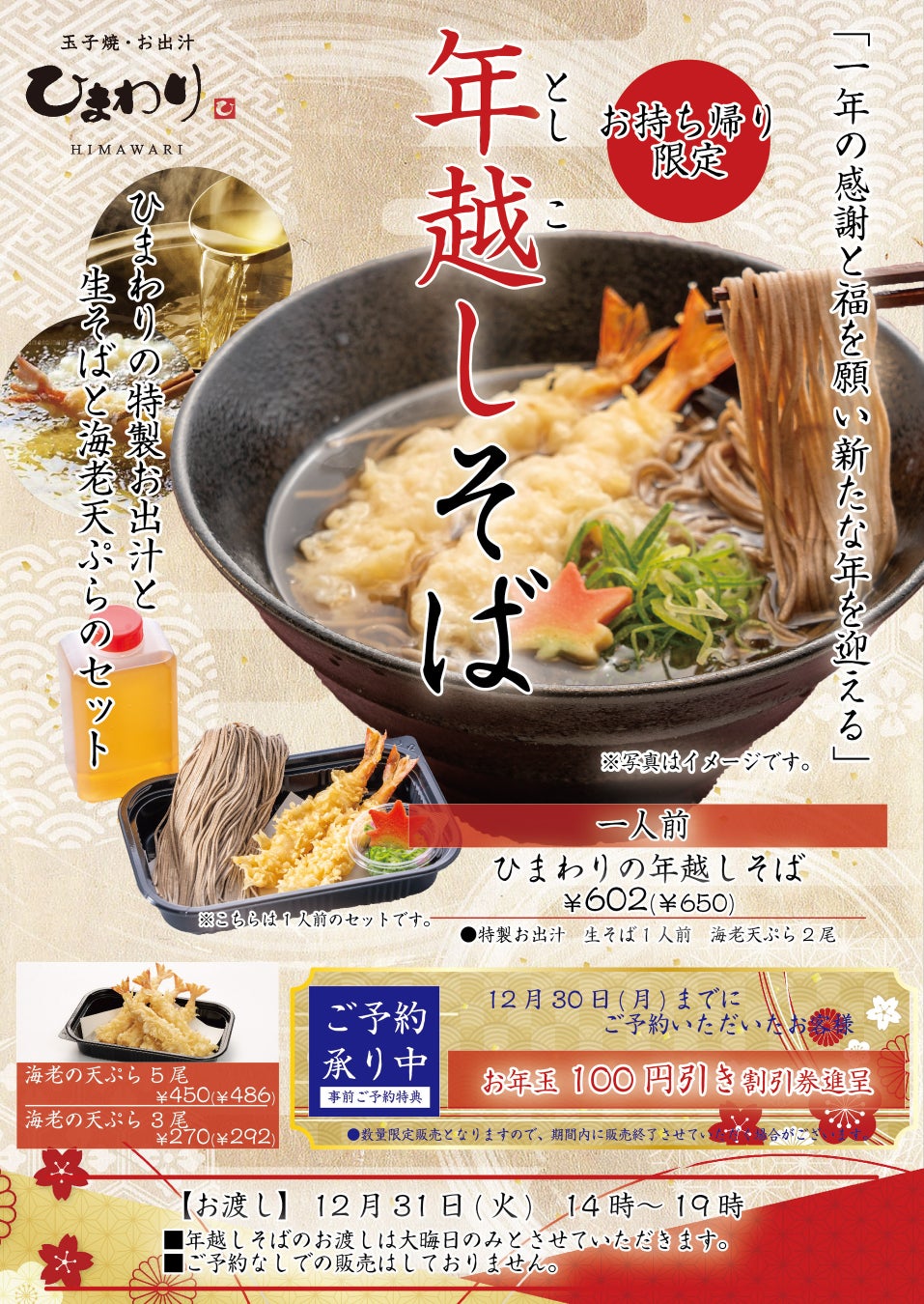 ただいま、 ひまわりの特製お出汁を使用した「年越しそば」予約を受け付けております。今年一年に感謝を込めて、ひまわりの特製お出汁と自慢の二八そば、サクサクとした食感が楽しめる海老天を自宅で味わえる「年越しそば」を事前予約限定でご予約受付中!ご自宅でひまわりの出来立て年越しそばをご賞味ください。12月30日までにご予約いただいたお客様には、特典として「お年玉100円引き割引券」を進呈しております。新年もお得にひまわりをご利用くださいませ。
