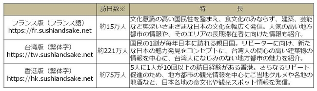 このたび新設する3つの国と地域版は、ヨーロッパの拠点となるフランス、訪日観光客数が多く東アジアの拠点となる台湾・香港と、いずれもぐるなびの観光インバウンド戦略を見据えたものです。2015年3月までに2013年度の2倍の日本ファン獲得を目標に、日本往復航空券が当たるオープニングキャンペーンなど各種施策を実施し、“日本ファンづくり”を強く促進します。