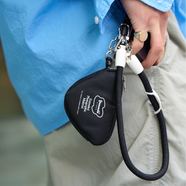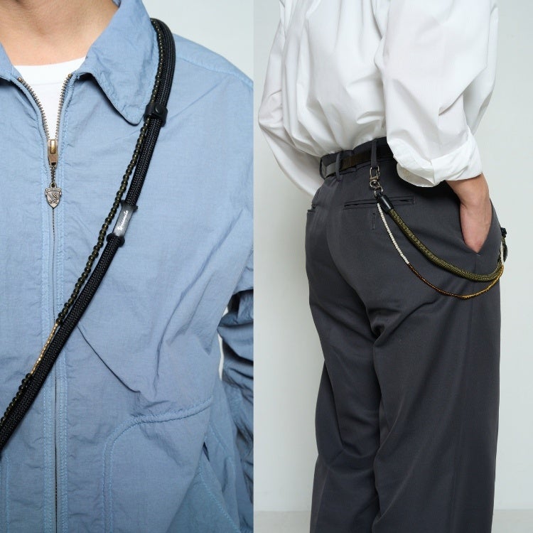 今回待望の新作として2WAY SHORT STRAPがデビュー。ロープの両側にフック金具が付くことで、より自由なスタイルでご使用いただけます。付属のアタッチメントを使用すれば、モバイルハンドストラップとして使用でき、ご自身の財布などに付ければウォレットチェーンのような使用も可能です。