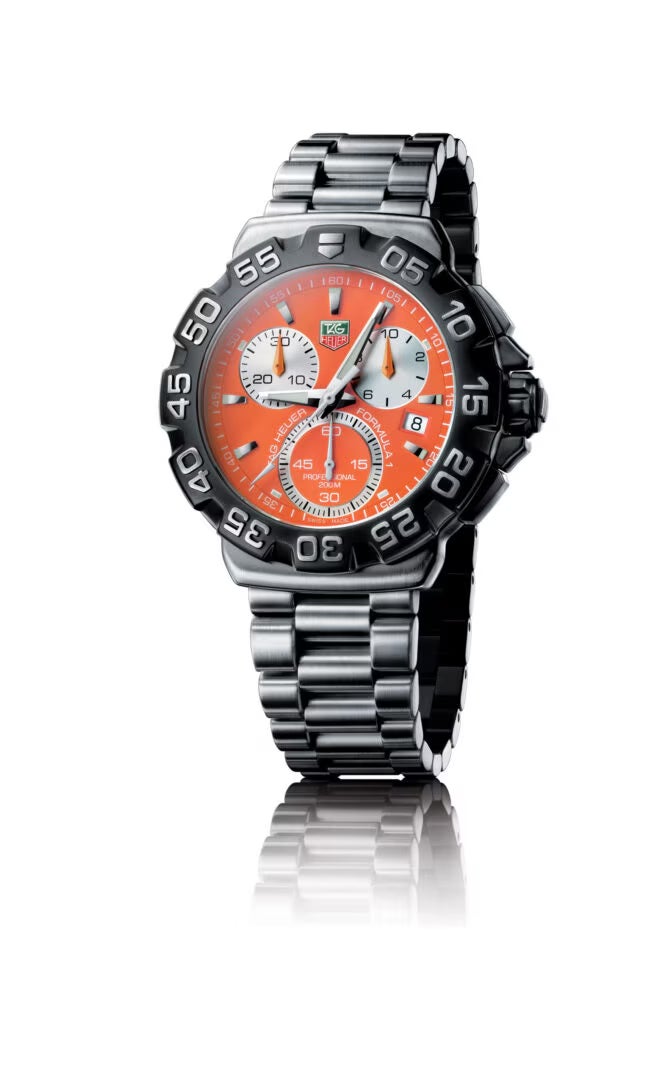 同年、タグ・ホイヤーは、「タグ・ホイヤー フォーミュラ1」という絶妙なネーミングの画期的な新作時計のコレクションを発表します。常識を覆す鮮やかなカラーのケース、ストラップ、ダイヤルを備えたこのモデルは、文化的な影響力を持つようになり、驚くほどの成功を収め、タグ・ホイヤーとモータースポーツとのかけがえのない絆を証明するものとしてこの時代の必携のアイテムとなりました。