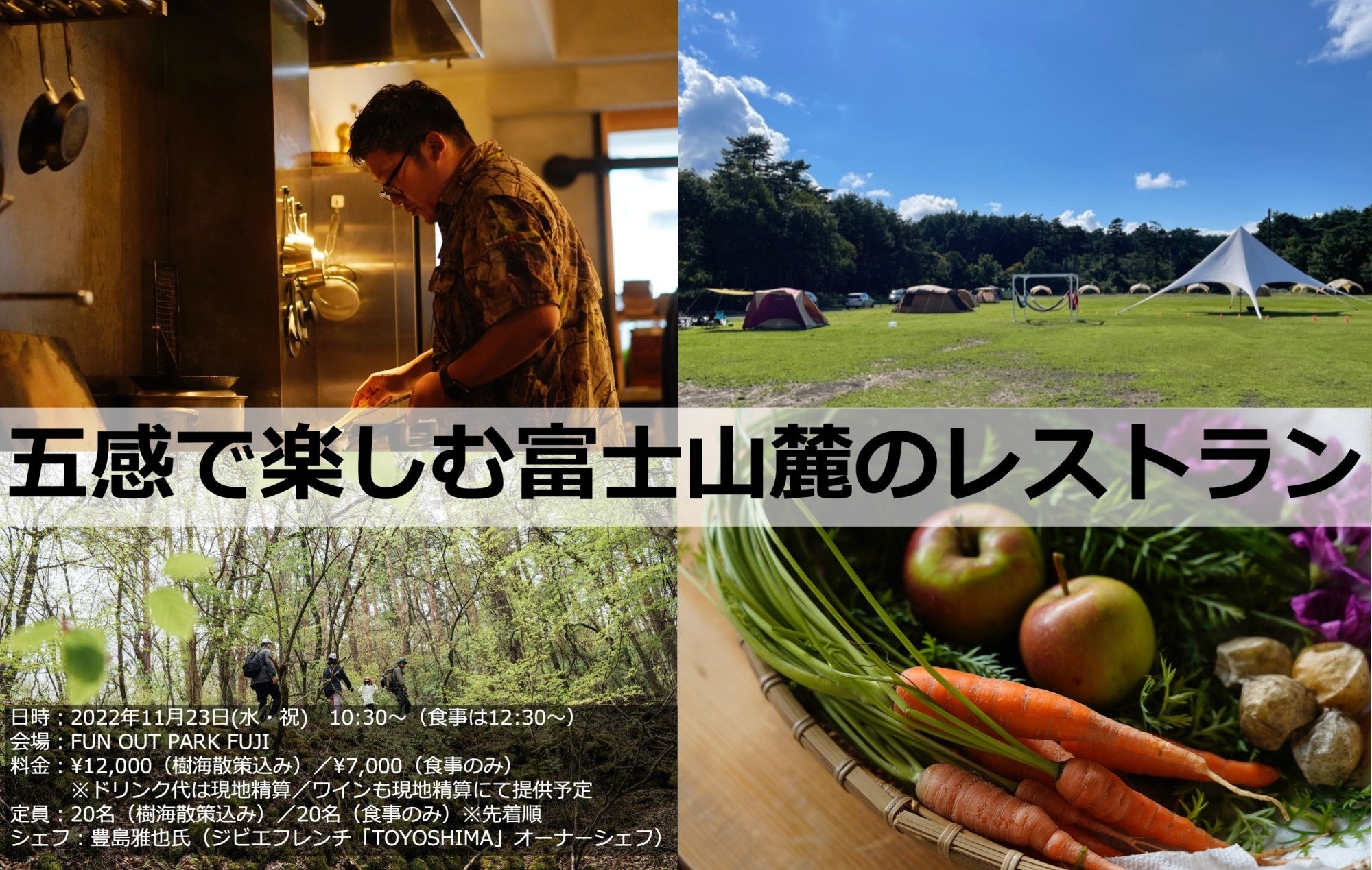 ジビエフレンチ「TOYOSHIMA」オーナーシェフ豊島雅也氏をお招きして広々とした屋外で自然を感じながら地産の食材やジビエを堪能することができる、「五感で楽しむ富士山麓のレストラン」が1日限定で開催されます。