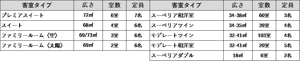 243室ある客室は、35㎡ほどの広さのタイプが最も多く、3~4名様でもお泊りいただけます。また、約70㎡のスイートルームやファミリールームは最大6~7名様のご宿泊が可能で、ファミリー旅行やグループ旅行に最適です。