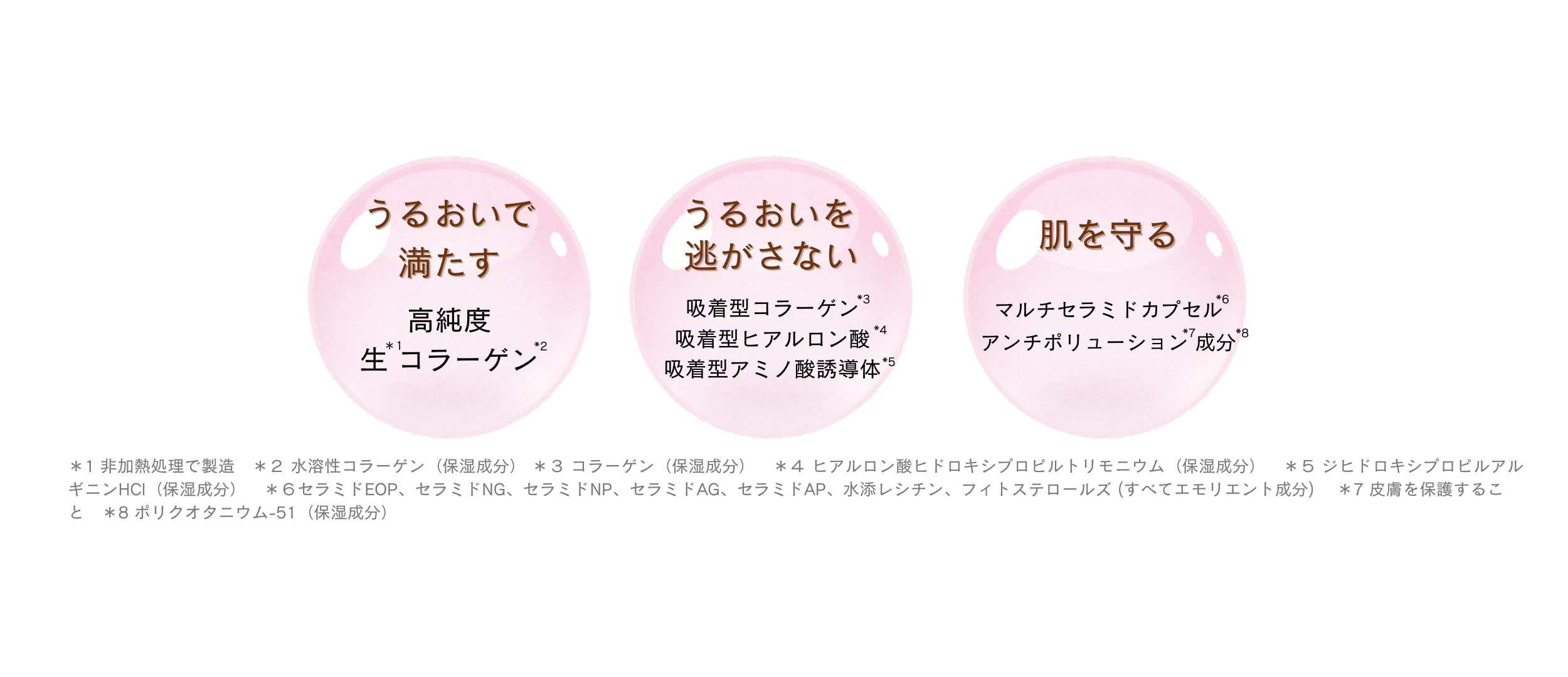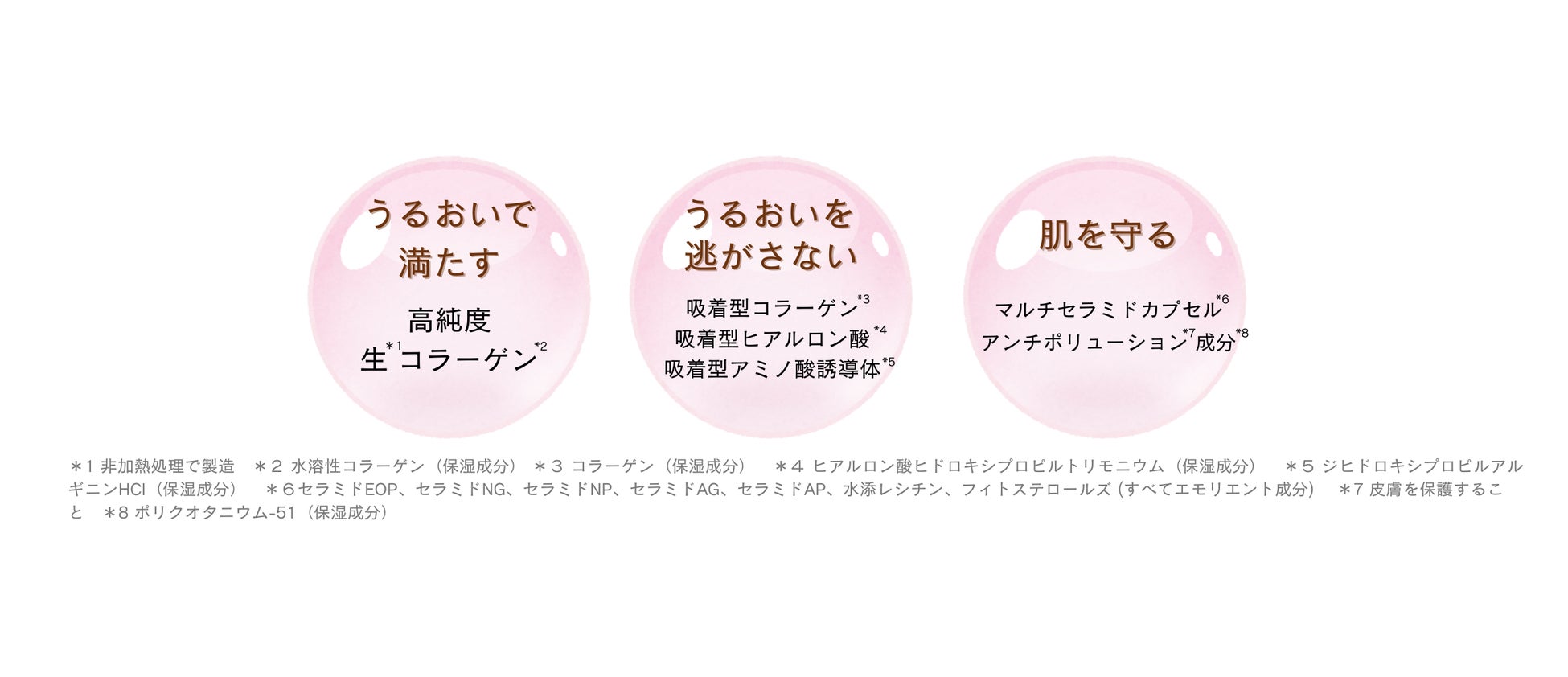 ・肌のコラーゲンと同じ構造を保ったまま抽出した高純度の生(※6)コラーゲン(※7)が、肌の隅々までうるおいで満たし水分を抱え込み、しっとりとキメの整った肌へ導きます。