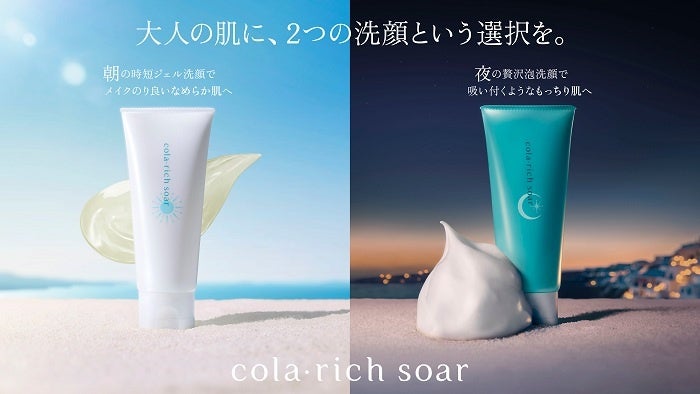 キューサイ株式会社(本社:福岡市中央区、代表取締役社長:石川 順朗)は、20年以上のコラーゲン(※1)研究知見を活かし、2025年4月に誕生した「cola・rich soar(コラリッチ ソア)」シリーズより、朝と夜の肌環境に合わせた朝用洗顔・夜用洗顔の2品を、2026年4月15日(水)に発売いたします。「朝は時短ジェル洗顔で、寝起きの肌を素早く整え化粧ノリのいい肌へ」「夜は濃密泡洗顔で、本格エイジングケア※2をしながらもっちりとした肌へ」、洗顔で朝と夜のなりたい肌に整える新習慣をお届けします。