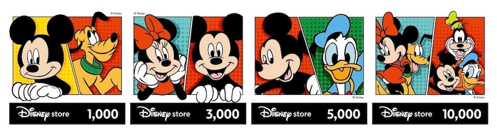 「ディズニーストアeギフトカード」は、全国のディズニーストア45店舗(2024年6月末時点)(※1)、およびディズニー公式オンラインストア ディズニーストア.jpでお会計の際に利用可能なeギフトです。ギフトの種類は、「ディズニーストアeギフトカード 」1,000円分、3,000円分、5,000円分、10,000円分の全4券種で、いずれも「giftee Box®」のみで入手できる限定デザインです。ディズニーストア店舗では会計時にバーコードを提示しレジで読み込むことで、ディズニーストア.jpではeギフト券面に記載されているギフトコードを、ご注文手続き画面に入力することで券面金額分をお支払いにご利用いただけます。