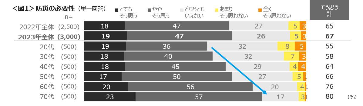 防災の必要性を感じるかの設問に対し「とてもそう思う」19%、「とても+ややそう思う」は67%であり、年齢が上がるほど必要性が高まり、70代では” そう思う”割合が80%に達する。<図1>