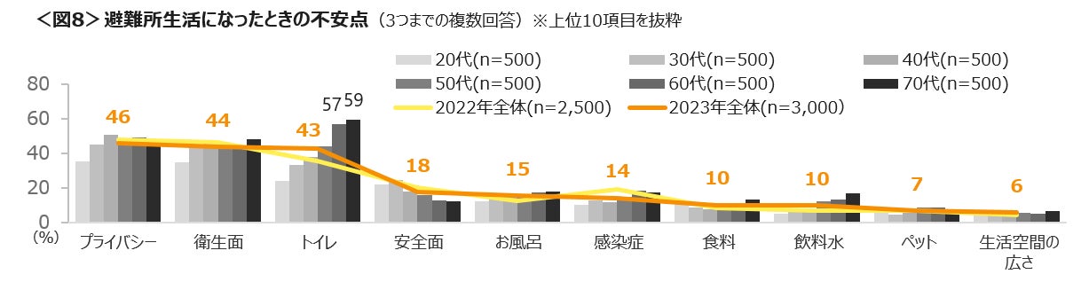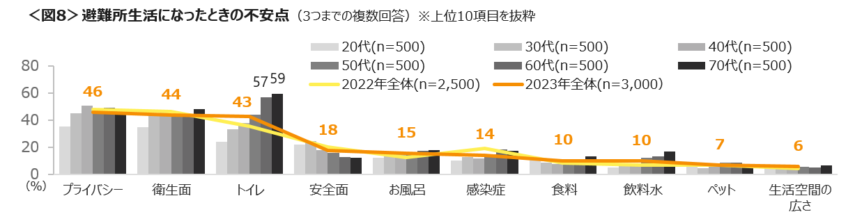 避難所生活になったとき不安点は「プライバシー」「衛生面」「トイレ」の3つが多く、特に60~70代は「トイレ」への不安が6割近くと高い。<図8>
