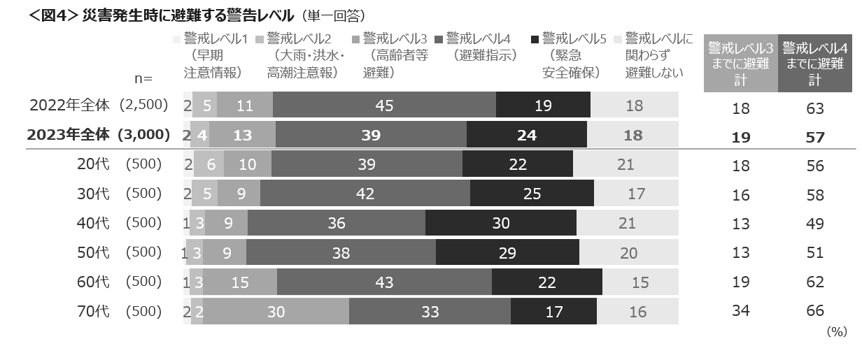 災害発生の恐れがある場合、どの警戒レベルで避難するかを聴取した。「警戒レベル4(避難指示)」で避難する人は39%、次いで「警戒レベル5(緊急安全確保)」の24%である。「警戒レベル1(早期注意情報)」から「警戒レベル3(高齢者等避難)」までに避難するのは、全体で19%、70代はその割合は高まり34%である。内閣府や消防庁は「警戒レベル4」までに必ず避難を呼びかけているものの、それまでに避難するとした割合は57%にとどまり、乖離がみられた。<図4>