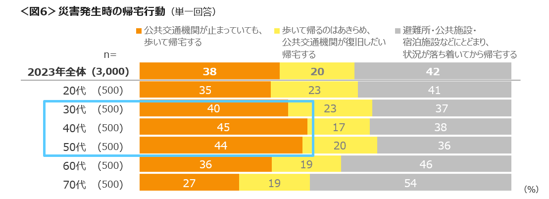 外出時に災害が発生した際の行動予定は、「施設にとどまり状況が落ち着いてから帰宅」は42%、「公共交通機関が止まっていても歩いて帰る」が38%と二分し、30~50代では「歩いて帰る」が「落ち着いてから帰宅」を上回る。<図6>