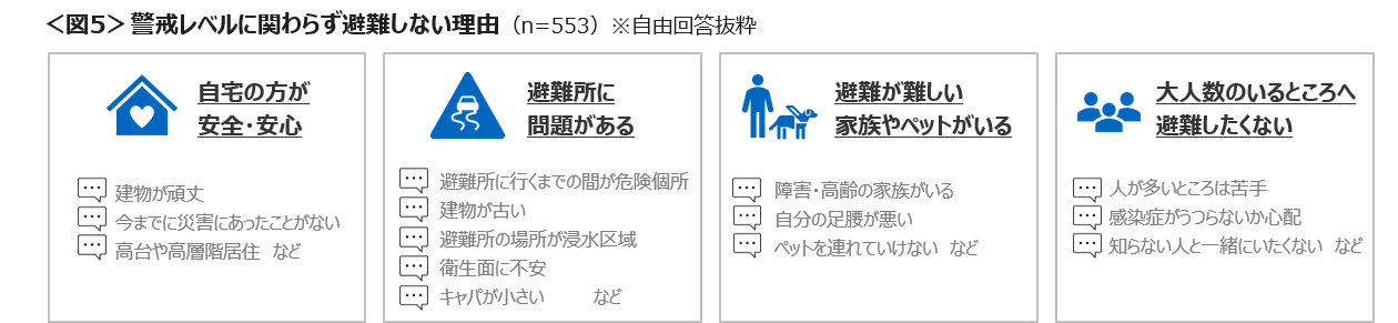 「警戒レベルに関わらず避難しない」理由は、「自宅の方が安全」「避難所に問題がある」「避難が難しい家族やペットがいる」などの声があがった。<図5>