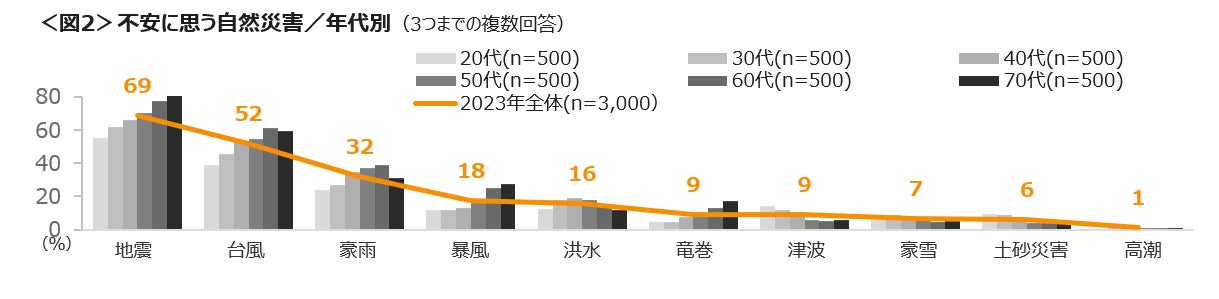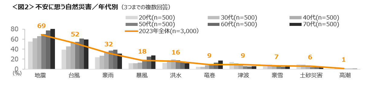 不安に思う自然災害を3つまで聴取した結果、「地震」69%、「台風」52%、「豪雨」32%であった。「地震」「台風」「暴風」は防災の必要性と同様に年代が高まるほど不安度も強い。<図2>
