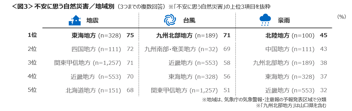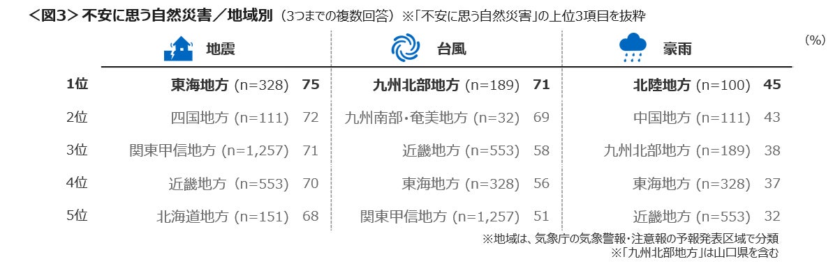 地域別には、南海トラフ地震の可能性のある東海、四国、関東甲信、近畿地方で「地震」に対する不安が7割を超えた。また、「地震」よりも「台風」への不安が強かったのは、九州北部と九州南部であった。<図3>