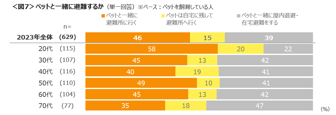 避難指示が出た後のペット同行避難について「ペットと一緒に避難所へ行く」が46%、「ペットと一緒に屋内退避・在宅避難をする」は39%であり、ペットを飼っていることで避難所へ行くことに躊躇している人も70代を中心にある程度いるとみられる。<図7>