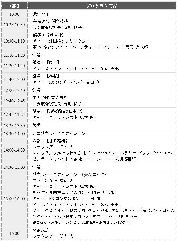 本セミナーには、マネックス証券が誇る講師陣が揃って登壇し、それぞれの専門分野について、直近のマーケットの振り返りや今後のマーケット展望、ポートフォリオ提案などを独自の視点でお届けいたします。世界各国の金融政策や経済環境など、世界情勢が日々変化し、投資環境も大きく変動するなか、お客様にとって参考となる今後の投資戦略についてお伝えしてまいります。