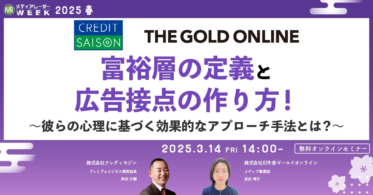 株式会社アイズ(所在地:東京都渋谷区、代表取締役社長:福島範幸、東証グロース:5242)が運営するNo.1*の広告業界のプラットフォーム「メディアレーダー」が主催するマーケティングセミナーイベント「第17回メディアレーダーWEEK 2025 春」にて、富裕層向けマーケティングについての専門家たちが3/14(金)に登壇します。視聴申し込みは無料です。