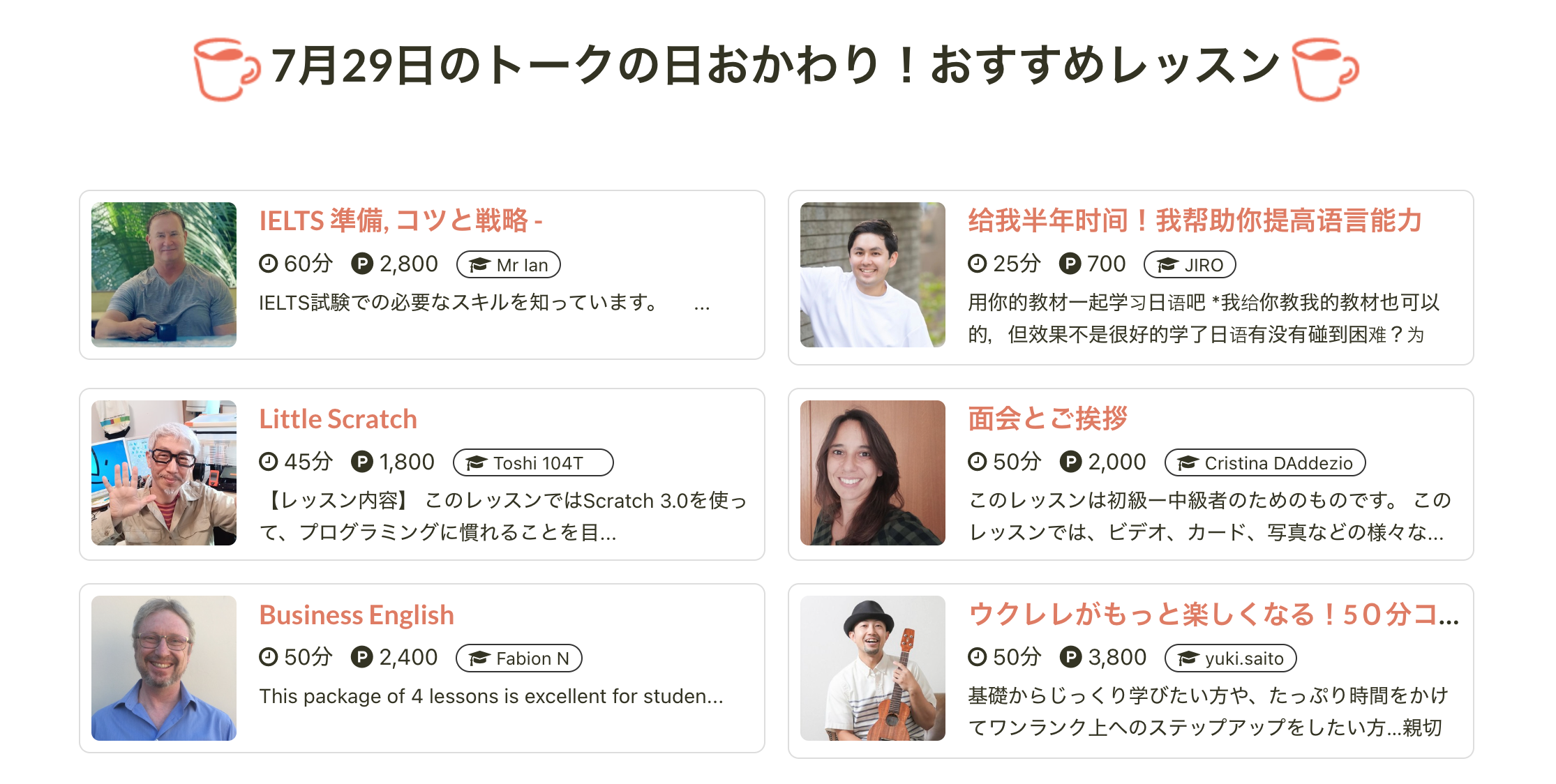 2022年7月29日0時〜23時59分までに受講したレッスンのうち、高い金額順に3件まで後日30%分のポイントがユーザーアカウントにバックされます。
