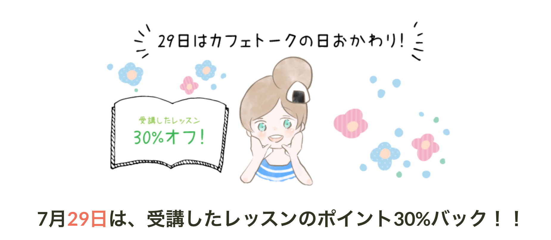 - 「カフェトークの日」とは、日本最大級オンライン習い事サイト「カフェトーク」が毎月19日と29日に実施している30%ポイントバックキャンペーンです。