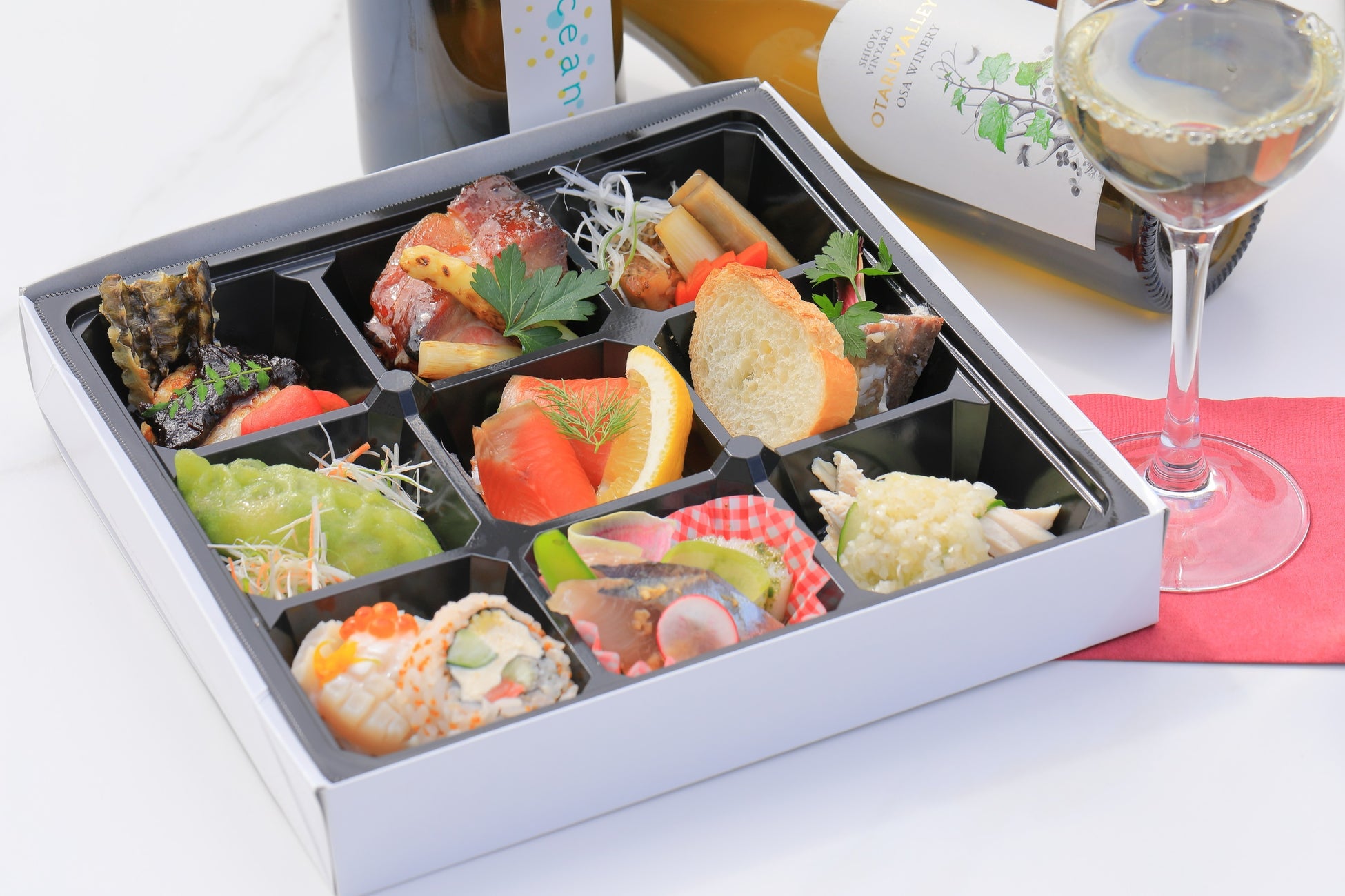ホテル内レストラン「The Ball 小樽」からは、OSA WINERYのワインの魅力をより深くご堪能いただける、小樽近郊の食材を丁寧に調理した9枡の創作料理ボックスをご提供いたします。すっきりとした白ワインとスパークリングワインとともに、北海道産ワインと食材が生み出すマリアージュを心ゆくまでお楽しみください。