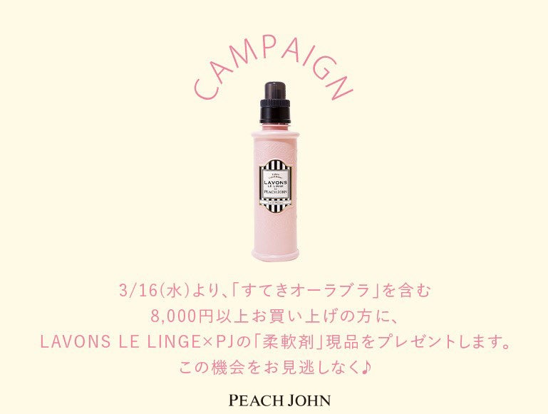 期間中、ピーチ・ジョン公式通販サイトまたは店舗にて、「すてきオーラブラ」を含む税込8,000円以上ご購入のお客様
