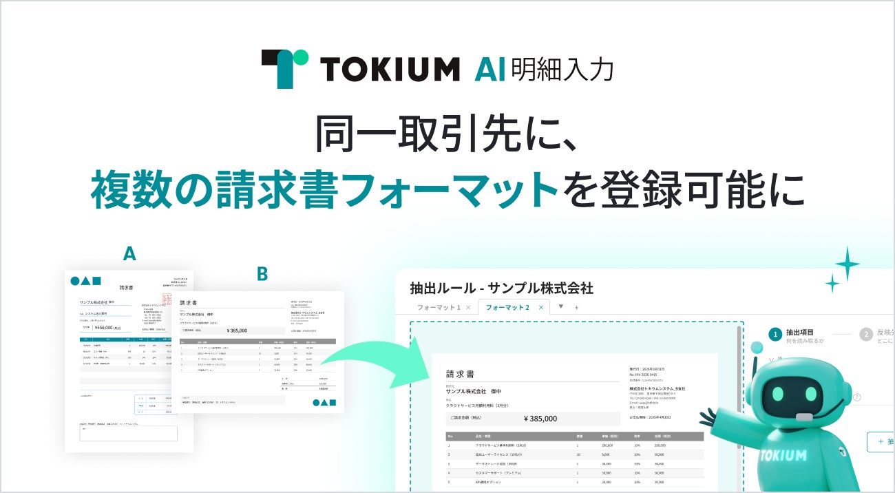 経理AIエージェントを提供する株式会社TOKIUM(本社:東京都中央区、代表取締役:黒﨑賢一、以下「TOKIUM」)は、TOKIUM AI明細入力に同一取引先に対して複数の請求書フォーマットを登録できる機能を提供開始しました。これにより、同じ取引先からフォーマットが異なる請求書を受領した場合でも、別々のルールをもとに自動で仕訳入力が可能になります。