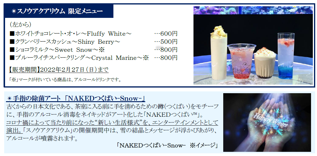 『マクセル アクアパーク品川』(所在地:東京都港区高輪4-10-30品川プリンスホテル内、館長:棚原 徹)は、2021年12月29日(水)~2022年2月27日(日)までの期間、シーズナルイベントとして「NAKED SNOW AQUARIUM(ネイキッド スノウ アクアリウム)」を開催します。