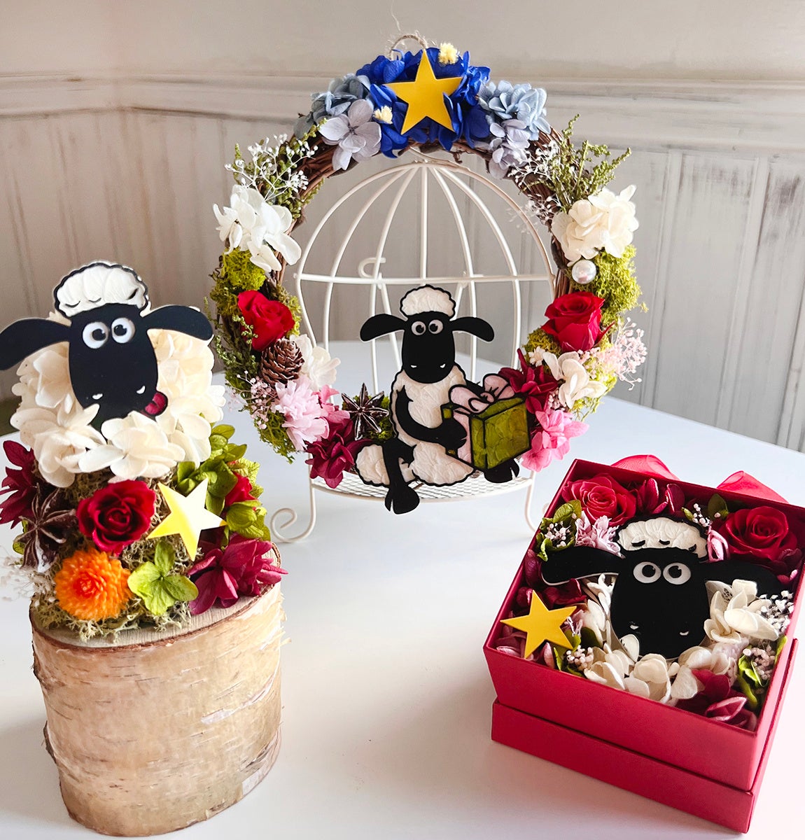 世界170ヶ国で愛される、イギリス生まれのクレイ・アニメーション作品「ひつじのショーン」。いたずら好きな主人公・ショーンを水やり不要で枯れないお花・プリザーブドフラワーで描いた3つのアレンジメントです