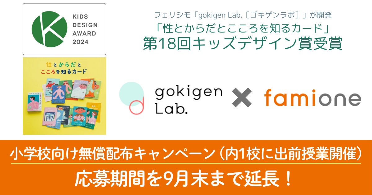「子どもを願うすべての人によりそい 幸せな人生を歩める社会をつくる」をビジョンに掲げ、法人の従業員向け福利厚生や自治体の住民向け支援を行うヘルスケアサポートサービス「ファミワン」 https://famione.com/benefit/ などを展開する株式会社ファミワン(本社:東京都渋谷区、代表取締役:石川勇介)は、株式会社フェリシモ(本社:兵庫県神戸市、代表取締役社長:矢崎和彦)が展開する、「gokigen Lab.[ゴキゲンラボ]」(以下「ごきげんラボ」)と共同で、性教育ツール「性とからだとこころを知るカード」を全国の小学校を対象に配布キャンペーンを行っており、「性とからだとこころを知るカード」が第18回キッズデザイン賞を受賞したことから、当キャンペーンの応募期間を2024年9月30日(月)までに延長決定いたしました。 ▼特設サイト:https://felissimo.famione.com/