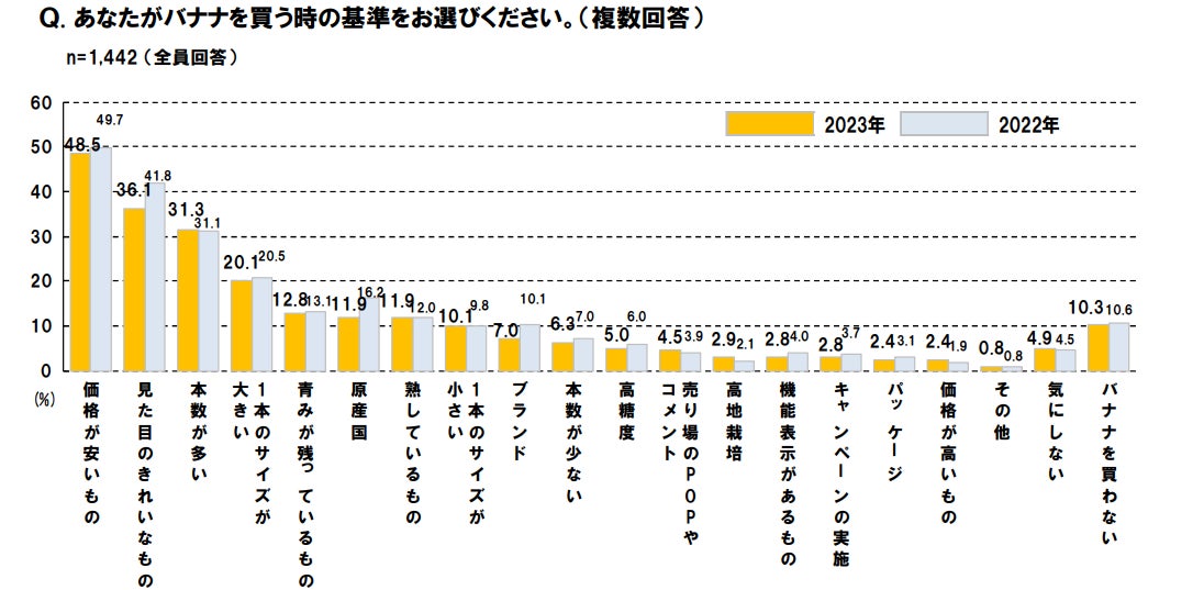 また、日本バナナ輸入組合の「第19回 バナナ・果物消費動向調査」(※2)によると、フルーツを購入する際に「見た目がきれいなもの」を購入するという方が約36%を占め、消費者や小売の求める規格等の基準に合わせるためには、不揃いや規格外が理由で一定数ロスが出てしまうということがわかります。