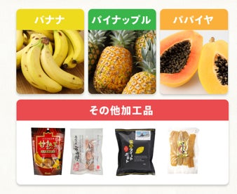 ・セット内容:バナナ、パイナップル、パパイヤ、野菜・フルーツを利用した加工食品などをお届け