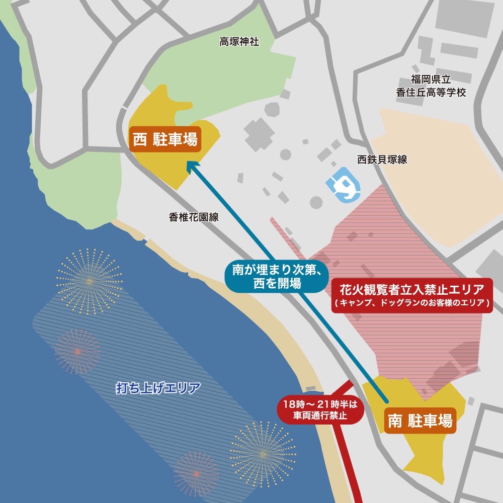 なお、当日同施設の近隣にて「第29回Fukuoka東区花火大会」(福岡市東区)が開催されます。花火大会の参加者が利用できる駐車場を周辺に増やすことで、駐車場不足の解消と周辺道路の交通渋滞緩和を目指します。
