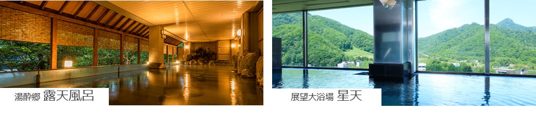 全国屈指の名湯、定山渓温泉。広々とした大浴場「湯酔郷」と、地上60mのホテル最上階から定山渓の景観を楽しめる展望大浴場「星天」をご用意しています。湯量豊富な名湯が、あたたかく包んでくれる至福のひとときをお楽しみください。